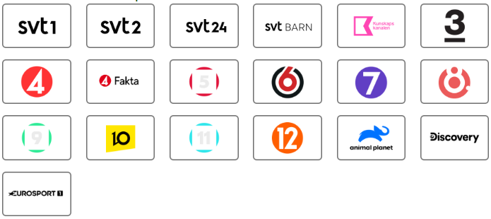 SVT 1 HD, SVT 2 HD, SVT 24 HD, SVT Barn HD, Kunskapskanalen HD, TV3 HD, TV4 HD, TV 4 Fakta HD, Kanal 5 HD, TV6 HD, Sjuan HD, TV8 HD, Kanal 9 HD, TV10 HD, TV 11 HD, TV 12 HD, Animal Planet HD, Discovery HD, Eurosport 1 HD.